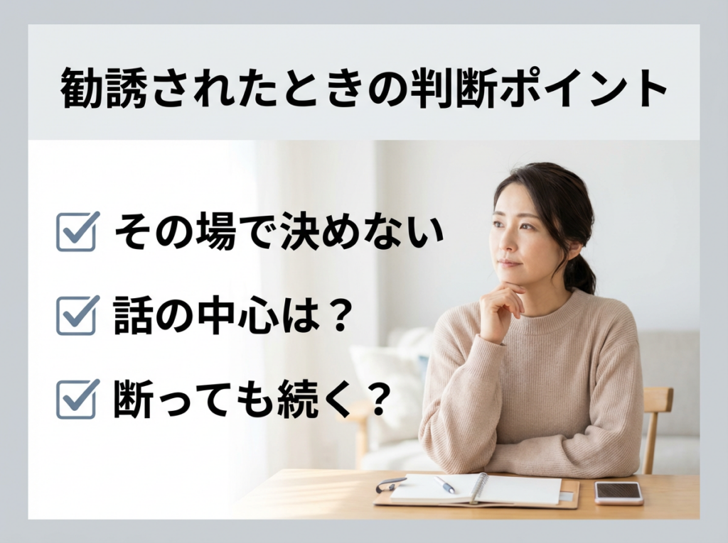 勧誘がすべて悪いわけではありませんが、もし少しでも不安がある場合は、次の点を冷静に確認しましょう。