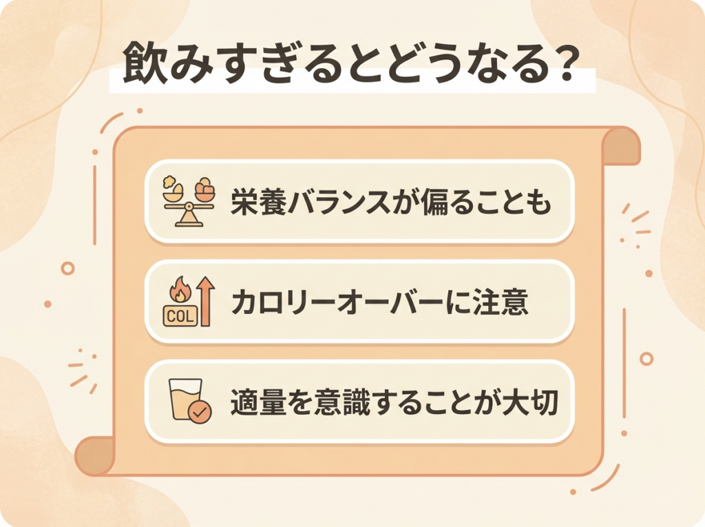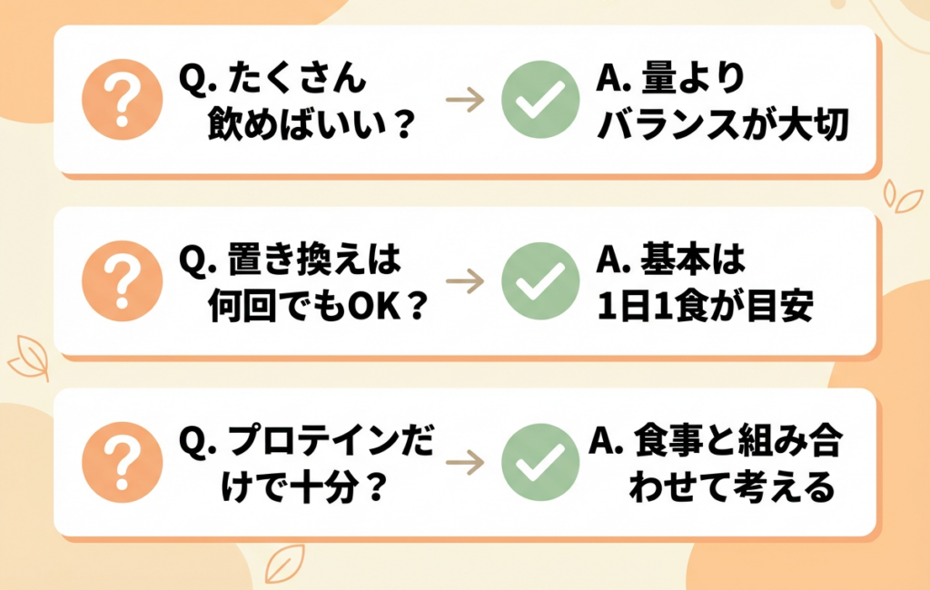 置き換えは1日1食が目安です。飲みすぎると栄養不足やカロリー過多、ビタミンAの過剰摂取の可能性もあるため注意が必要です。