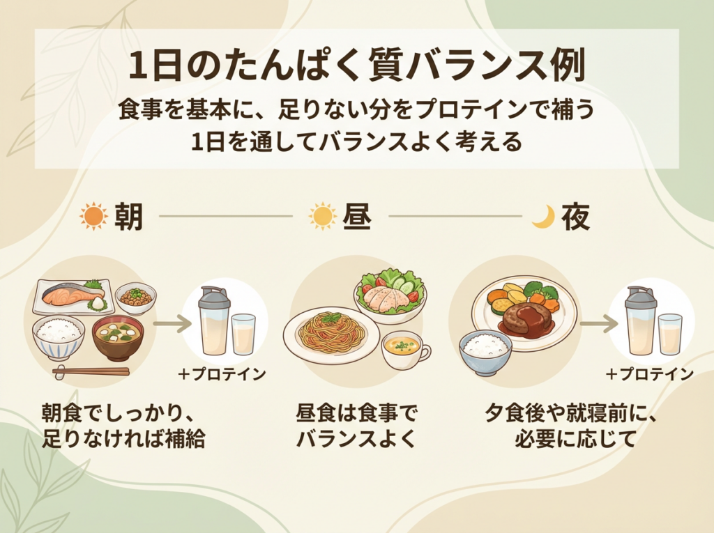 食事から補給するたんぱく質とプロテイン量を組み合わせて考えられると良いです。