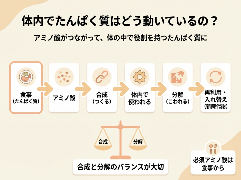 先ほどもお話ししたように体内でたんぱく質が合成されていいきますが、古くなった体内のたんぱく質は分解されてしまいます。