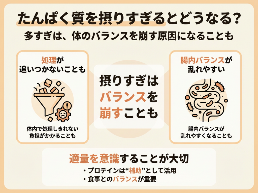 尿路結石や腸内環境の乱れを引き起こす可能性があります。たんぱく質は適量を守って摂取することが大切です。