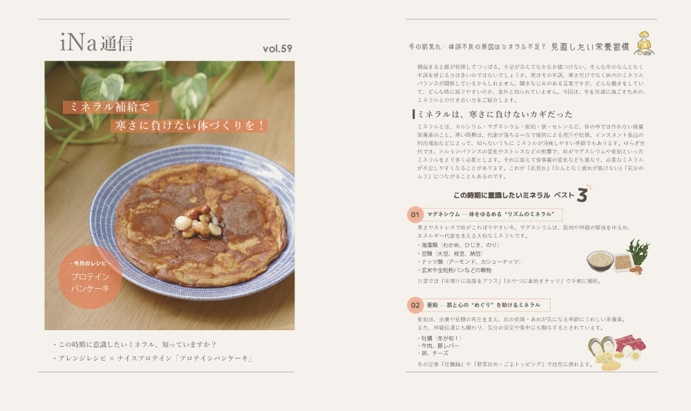 ミネラルとは、カルシウム・マグネシウム・亜鉛・鉄・セレンなど、体の中では作れない微量栄養素のこと。寒い時期は、代謝が落ちる一方で暖房による発汗や乾燥、インスタント食品の利用増加などによって、知らないうちに ミネラルが消耗しやすい季節でもあります。