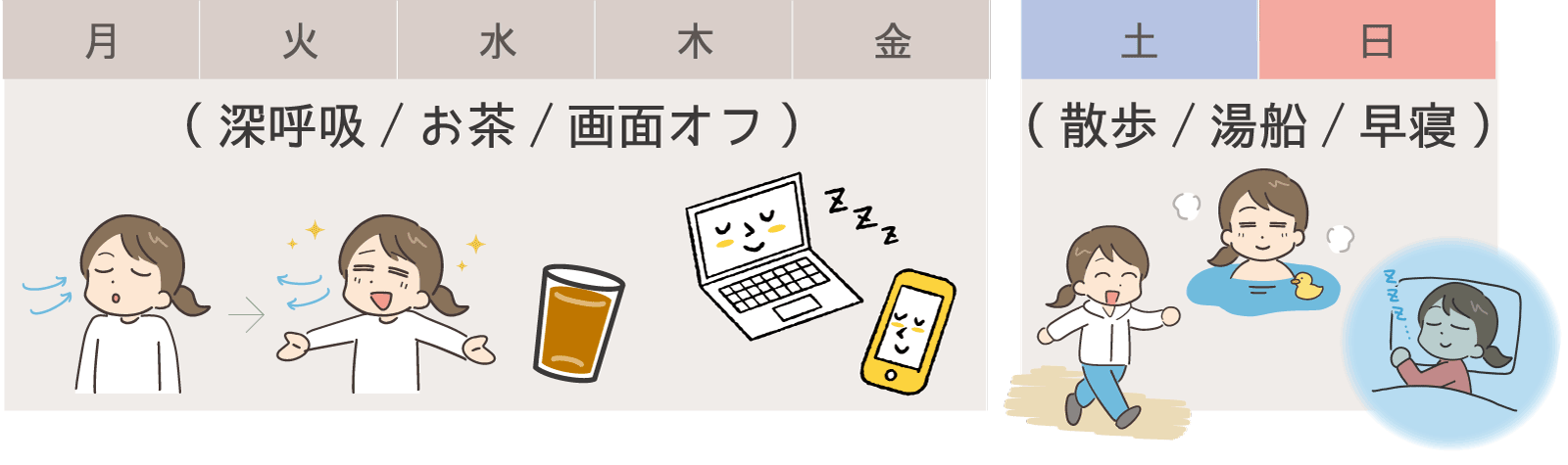 予定が続くと回復が追いつきにくいので、週に1回は何も予定を入れない日(または軽めの日)を意識して作ります。