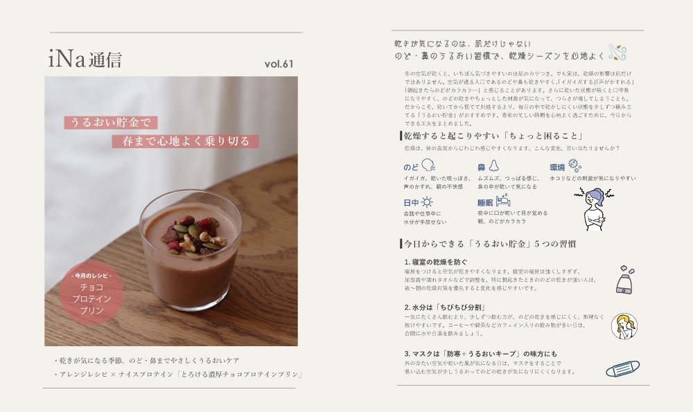乾燥は、肌だけでなく、のど・鼻の不快感や睡眠の質にも影響しやすいもの。乾くと口呼吸になりやすく、さらに乾きを感じやすくなる…という流れが起こることもあります。だからこそ、環境・水分のとり方・食事を、できる範囲で少しずつ整えていくのが「うるおい貯金」のコツです。まずは、自分がいちばん乾きやすい時間帯(朝/日中/夜)に合わせて、できることを1つだけ選んで始めてみてください。