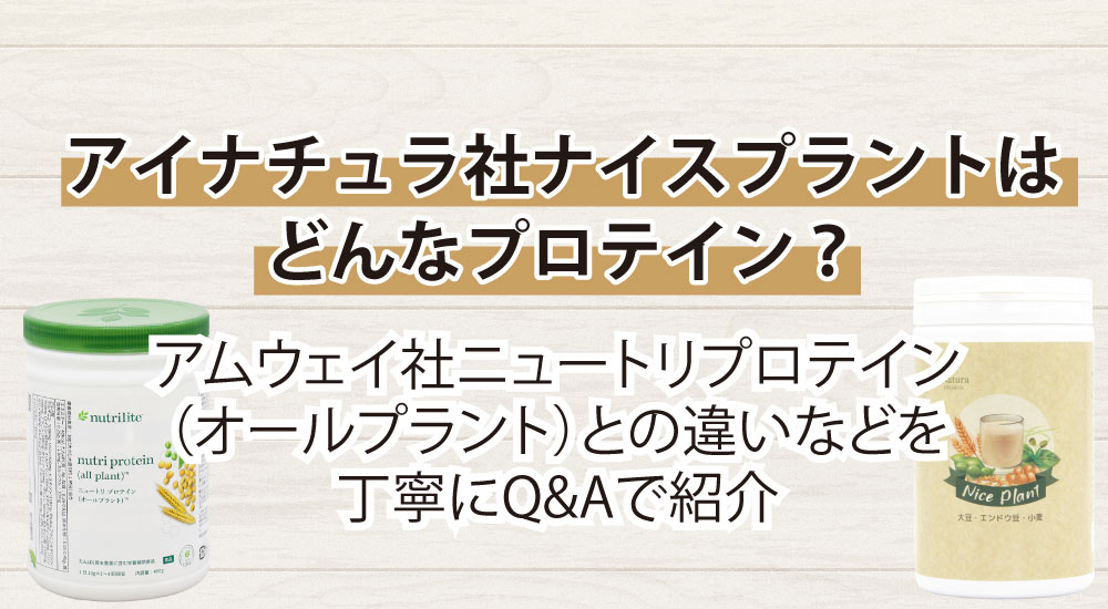 A. アイナチュラ社のナイスプラントは、大豆・小麦・エンドウ豆の植物性たんぱくを独自にブレンドしたプロテインです。原料や配合量、味わいまで全てが同じということはありません。
