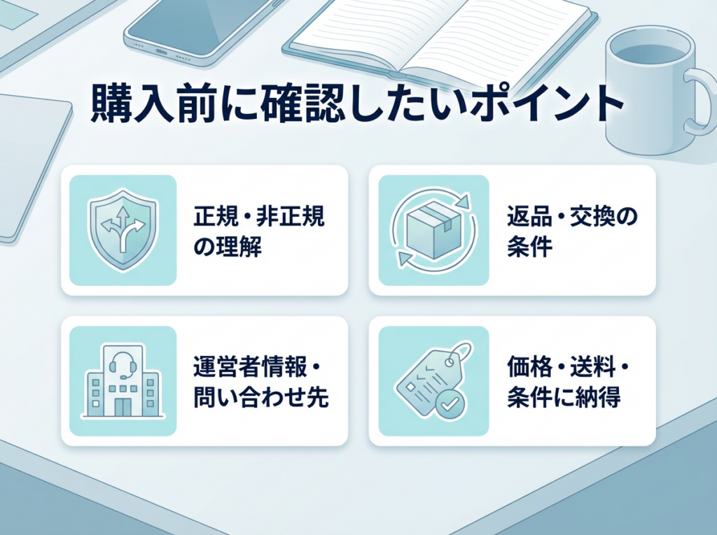 返品条件と運営者情報、そして「公式の保証対象外になり得る」点を理解して、納得して選ぶのが大事です。