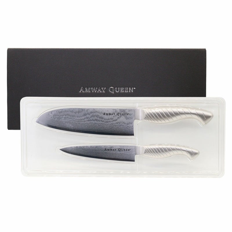 69層の金属からなるダマスカス鋼。職人による丁寧な研ぎ仕上げでの三徳ナイフとペティナイフのセットです。