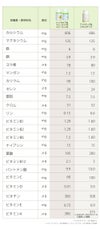 熱量 0~5kcal、たんぱく質 0~0.5g、脂質 0~0.5g、 炭水化物 0~1.2g、食塩相当量 0~0.013g、V.B1 1.29mg、V.B2 1.29mg、ナイアシン 15mg、パントテン酸 9.8mg、V.B6 1.5mg、V.C 60mg、V.D 5.0μg、V.E 6.72mg、葉酸 195μg、V.B12 2.1μg、ビオチン 300μg、Zn 7.5mg、K 99mg、Ca 234mg、Cr 51μg、Se 24μg、Fe 6.0mg、Cu 3.9mg、Mg 126mg、Mn 1.5mg、ヨウ素 78μg、P 0~5mg、V.K 0μg、Mo 0μg、β-カロテン 0.66mg