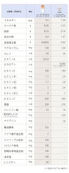 エネルギー 7.52kcal、たんぱく質 0.47g、脂質 0.18g、炭水化物 1.01g、食塩相当量 0.018g、βカロテン 3600μg、マグネシウム 134mg、セレン 50μg、VE 100mg、VB1 2.4mg、VB2 2.4mg、VB6 2.4mg、VB12 7μg、VC 500mg、ナイアシン 10mg、葉酸 210μg、パントテン酸 10mg、 穀物発酵エキス末(ダイジェザイム※) 150mg