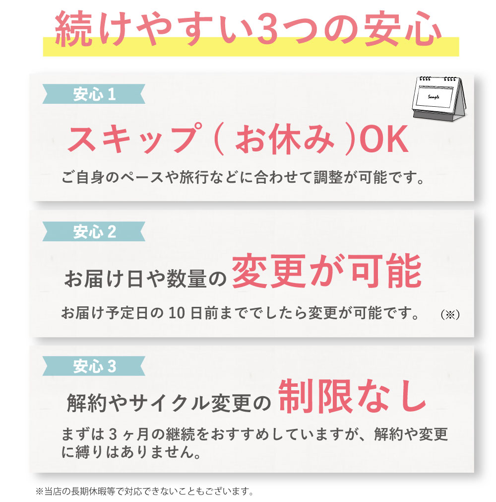 健康維持のため長くお続けになることをお勧めしておりますが、ご都合にあわせてスキップ、解約ができます。