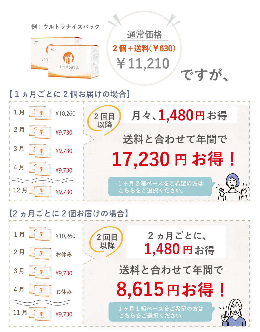 例えばウルトラナイスパックの場合、定期購入にお申込みいただくと以下のようにお得になります!